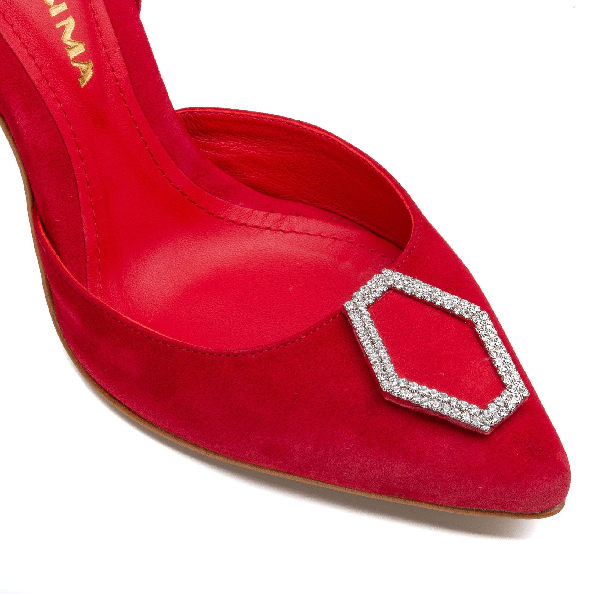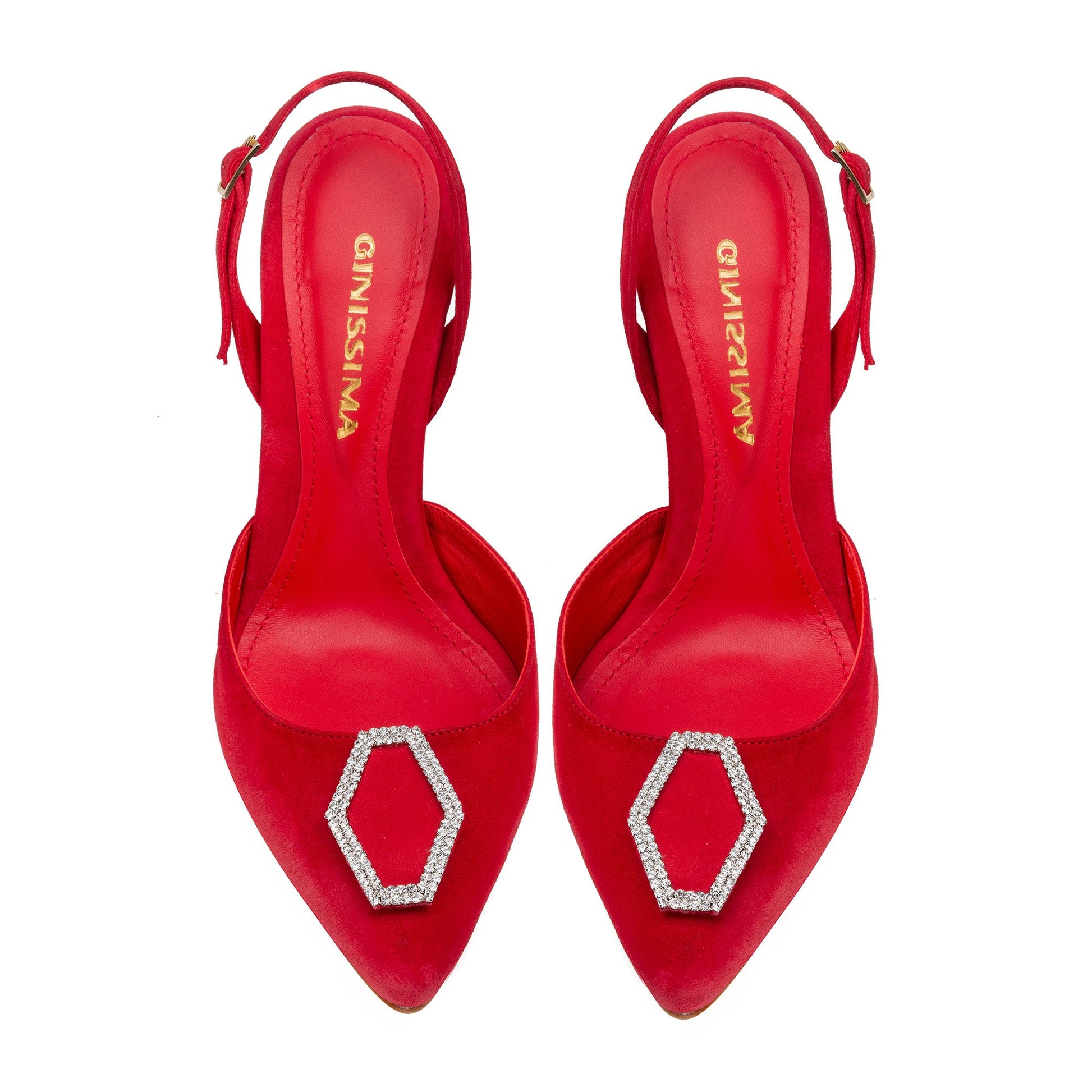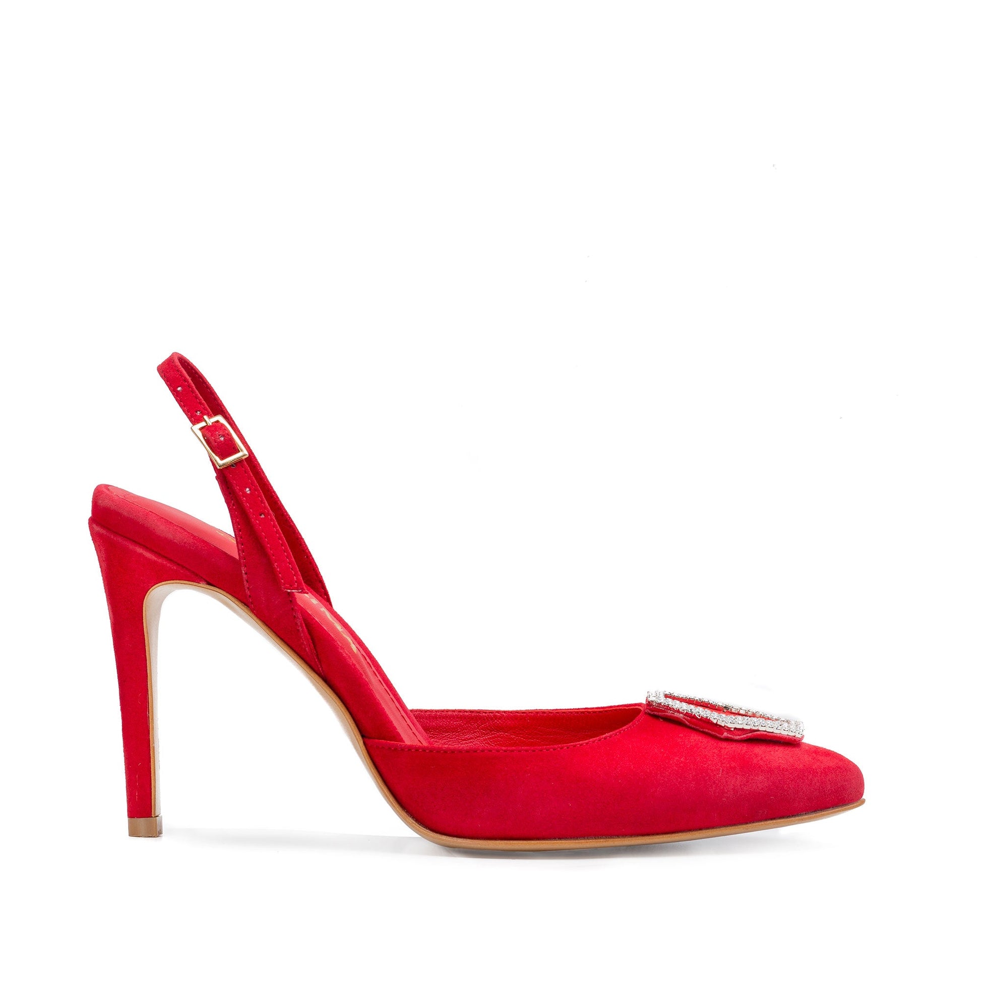 This red suede Alice slingbacks adorned with our signature diamond shaped crystal are the best choice for day or night, easy to slip on; artisanally handmade from the finest Italian leathers and materials.