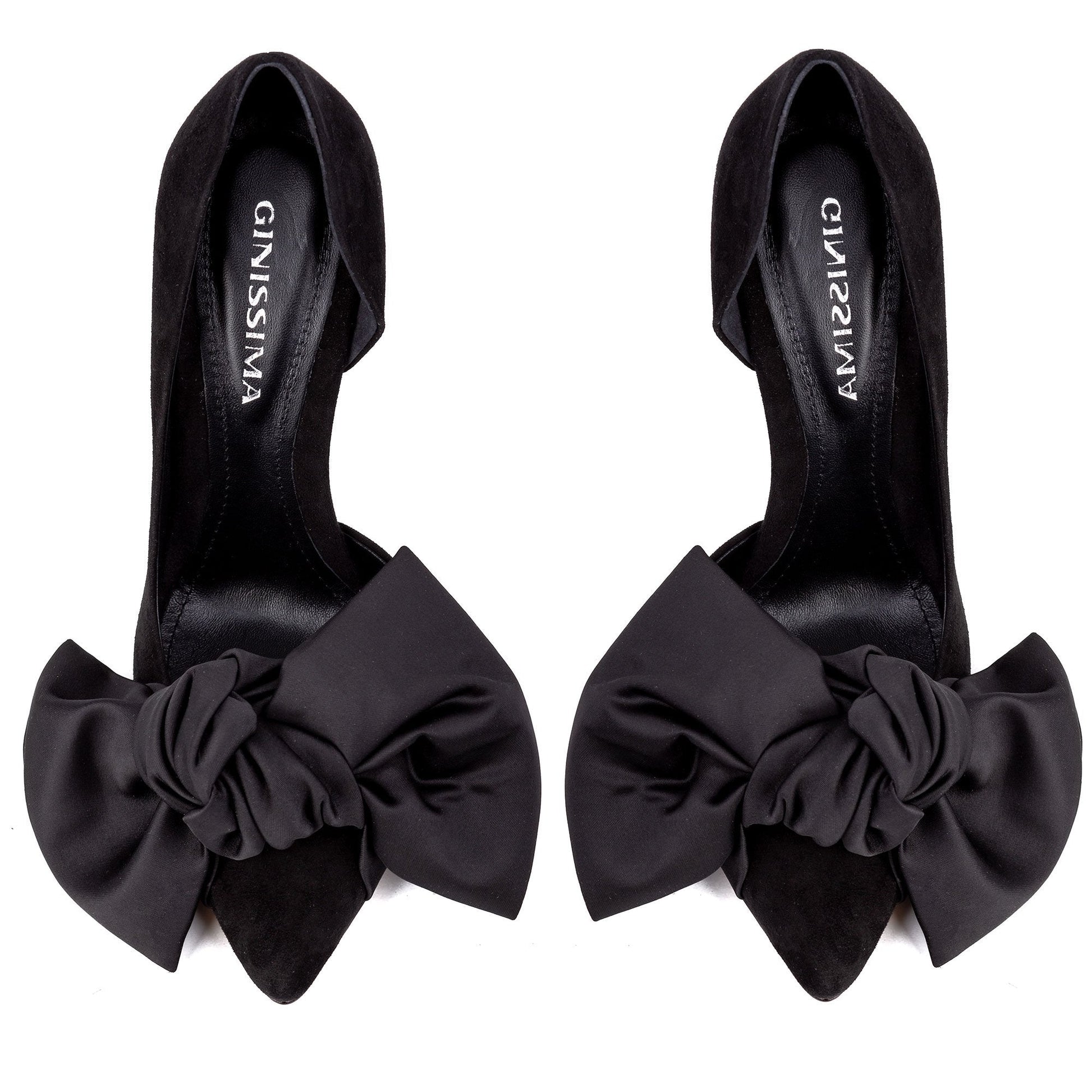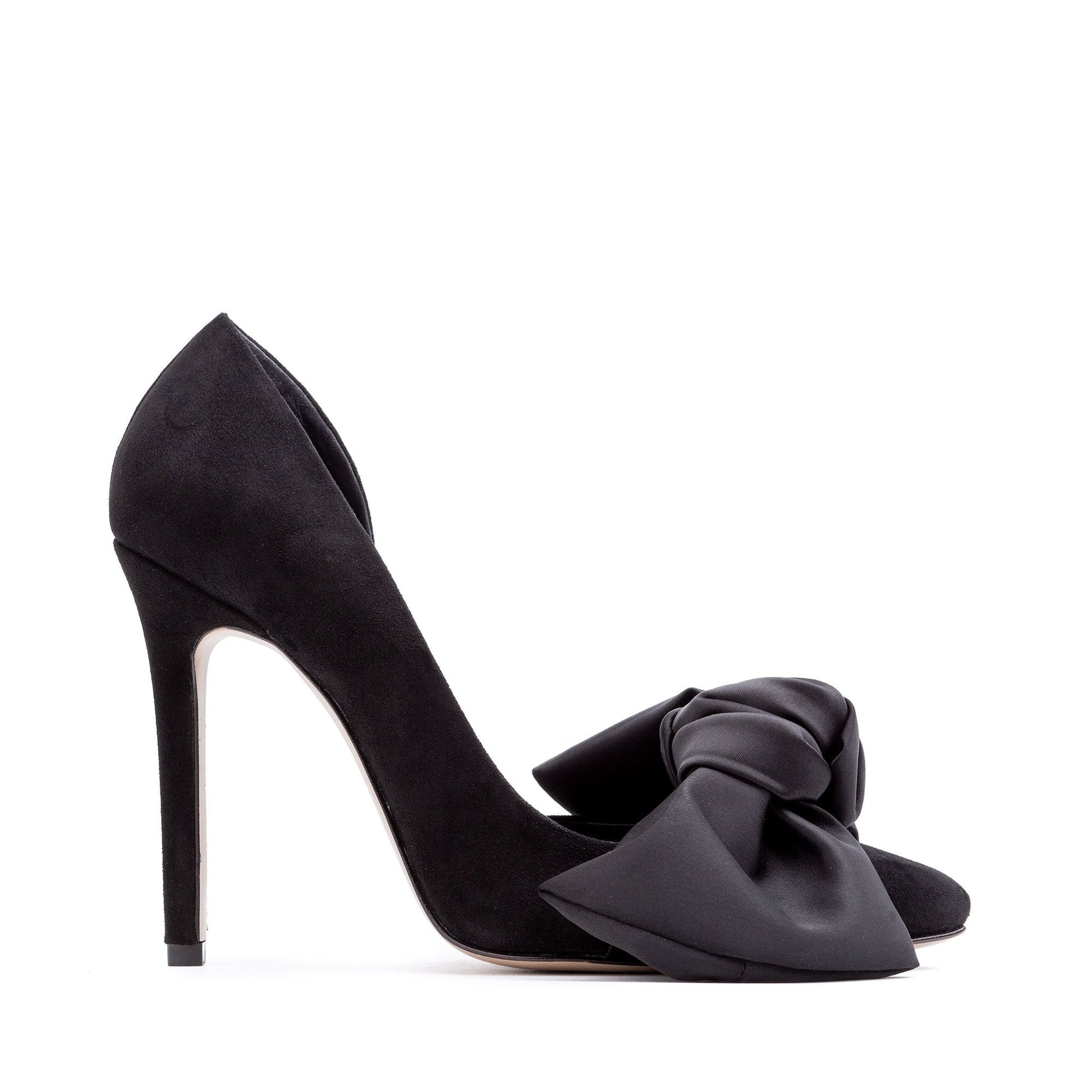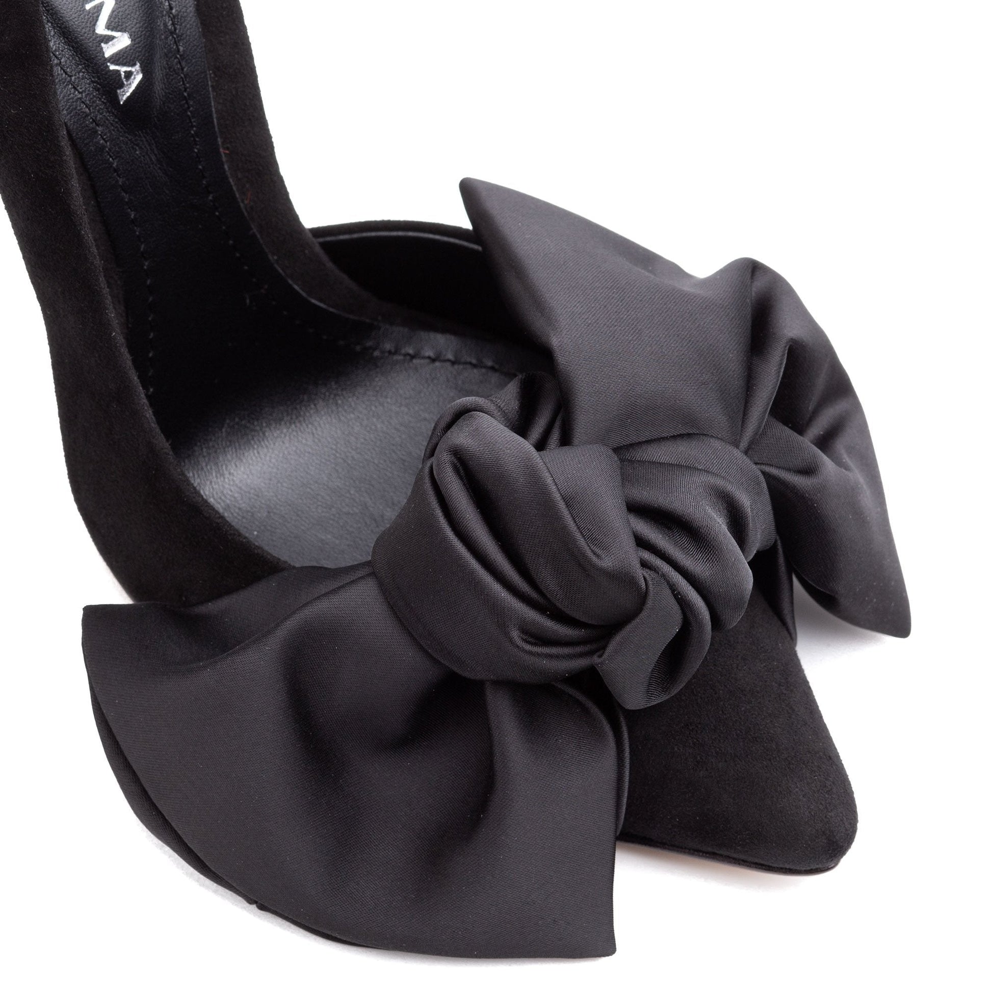 Samantha black suede and oversized black satin bow open sided stiletto